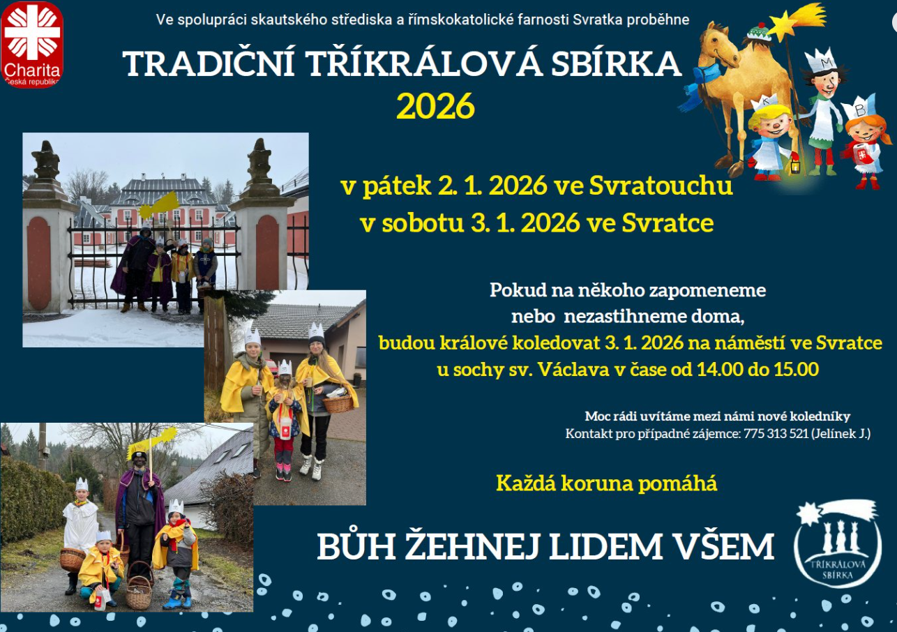 Ve spolupráci skautského střediska a římskokatolické farnosti Svratka proběhne TRADIČNÍ TŘÍKRÁLOVÁ SBÍRKA 2026 v sobotu 3. ledna 2026 ve Svratce a v neděli 4. ledna 2026 ve Svratouchu.